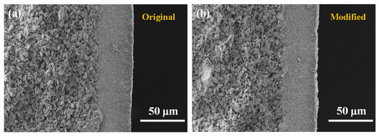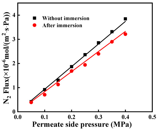 The N2 permeances of the original and grafted ceramic membranes at the transmembrane pressure of N2 ranging from 0.05 to 0.40 MPa, with the highest permeation fluxes of 1.01 × 10−5 and 0.967 × 10−5 mol/(m2∙s∙Pa), respectively, as shown in Figure 8. It indicates that the grafted ceramic membranes exhibited high hydrophobicity concurrently without causing much reduction of gas permeation. It was likely due to that the grafted C16 layer on the inner surface of pore channels was very thin. The thickness of the grafted layer was only a few nanometers (<3 nm) [24,25], which was much smaller than the pore sizes (0.1 μm for the top layer and 1.0 μm for the support layer). Therefore, the hydrophobic modification had an insignificant effect on the gas permeation.