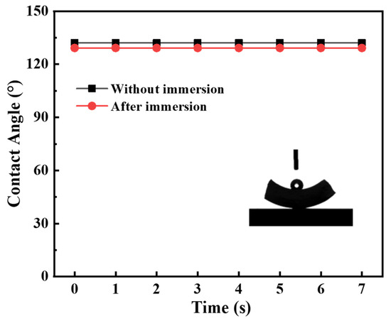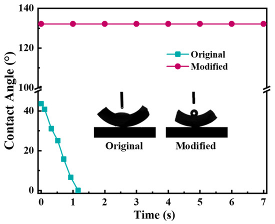 The hydrophobicity of the grafted ceramic membrane was tested in terms of water contact angle. The water contact angle of the original membrane decreased sharply from 40° to 0° in a few seconds due to the presence of hydroxyl groups (−OH) on the membrane surface, as shown in Figure 7. By contrast, the contact angle of the grafted membrane kept stably greater than 130°, indicating the modifier had been satisfactorily grafted and the surface of the ceramic membrane was hydrophobic.