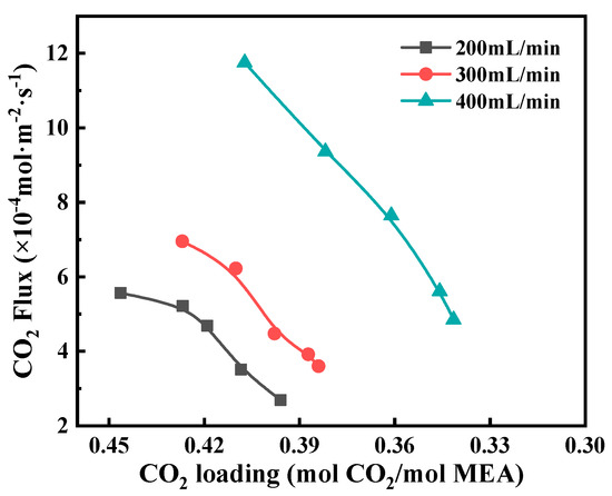 The effect of CO2 loading on the CO2 stripping flux can be seen in Figure 9. With the decrease of CO2 loading, the CO2 stripping flux decreased significantly. This is because the decrease in CO2 loading would lower the CO2 equilibrium partial pressure, reflecting the smaller driving force for CO2 mass transfer. Meanwhile, an increase in liquid flow was of great benefit to improving the CO2 stripping flux. This is because as the liquid velocity increased, the liquid temperature and CO2 loading were little changed and maintained at high levels, thus keeping high mass transfer performance. In addition, an increase in the liquid flow resulted in reduced liquid phase mass transfer resistance which had a great effect on the overall mass transfer resistance. It should be noted that a high liquid flow means a fast circulation rate for liquid solution circulating between the membrane contactor and the reboiler, which will consume more pump energy. Therefore, it is important to choose an optimized liquid flow.