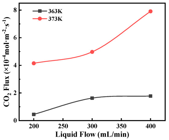 An increase in liquid temperature was of great benefit to increasing the CO2 stripping flux, as shown in Figure 10. This is because temperature directly affects CO2 equilibrium solubility and diffusion coefficients. The CO2 solubility in the MEA solution decreases exponentially with temperature [26], and the diffusivity increases in multiples of 4 by increasing the temperature by 10 K [27,28]. Thus, an increase in operating temperature leads to increases in both driving force and mass transfer coefficient for CO2 stripping. Moreover, an increase in the feed flow rate enabled reducing the temperature difference between the liquid bulk and the liquid–membrane interface, resulting in increased transmembrane pressure difference. The 363 K curve tended to a maximum as the feed flow rate further increased. This might be because the mass transfer in the feed side was negligible, and the transport in pore sizes governed the overall mass transfer process.