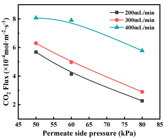 Regeneration pressure also impacts CO2 desorption flux. Lowering permeate side pressure enhanced the CO2 desorption flux, as shown in Figure 11. It can be explained that the decrease in the permeate side pressure is favorable for decreasing the CO2 partial pressure in the gas phase, thus improving the CO2 stripping driving force. However, a too low permeate side pressure will lead to the considerably high energy consumption of the vacuum pump. A moderate degree of vacuum condition is in favor of improving the CO2 membrane stripping performance, facilitating the CO2 transport in the permeate side, concurrently will not cost too much energy.