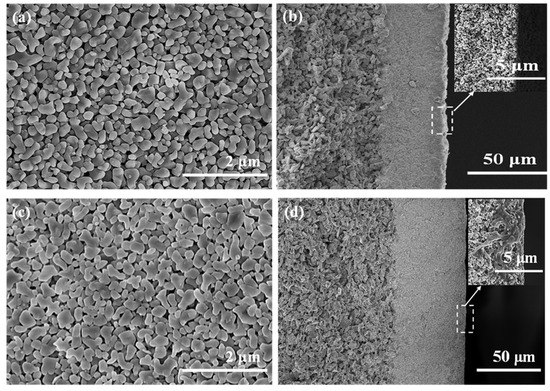 Field emission scanning electron microscope (FESEM) images of the α-Al2O3 membrane before and after immersion in MEA solution. (a) surface and (b) cross-section of the unimmersed membrane; (c) surface and (d) cross-section of the immersed membrane.