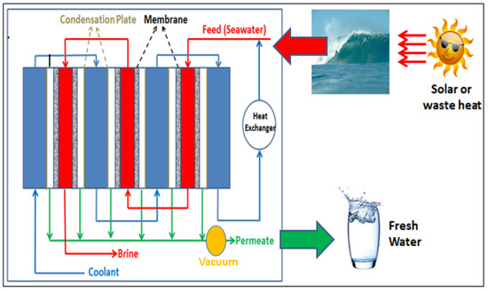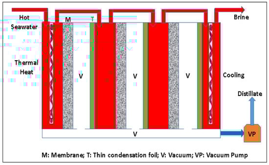 AGMD process operated at sub-atmospheric conditions or under the application of controlled vacuum in the air gap of an AGMD module is known as vacuumed air gap membrane distillation (VAGMED) process, as reported by Ghaffour and co-workers [73]. As per the simulation and experimental findings of this report, the removal of non-condensable gases from the air gap of an AGMD enhances the permeate flux by three times when the gap is maintained at the saturation pressure of the feed temperature. In a multi-stage process operation, the feed temperature decreases from the first stage to the last stage due to the respective mass transfer and heat transfer, and the vacuum in the air gap of the module can be adjusted as per the saturation pressure of the feed solution. This is the difference between V-MEMD and VAGMED processes. They have also discussed the importance and enhanced efficiency of the MD process that could be achieved by proper engineering and efficient staging of the process. Membrane pore wetting is less likely in this system compared to conventional VMD. A schematic of a multi-stage VAGMED process is shown in Figure 5. The effect of staging on the permeate flux in the VAGMED system and its relation to the membrane cost is also briefly discussed in this study. In this process, it is important to keep in mind that the more the gap pressure is reduced below the saturation pressure of the feed temperature, the lower the cooling temperature required for permeate condensation. Therefore, it is recommended to keep the gap pressure slightly below the saturation pressure of the feed temperature for the complete removal of the non-condensable gases from the air gap and to overcome the mass transfer resistance in the membrane structure. Thus, VAGMED is a combination of AGMD and VMD processes with the aid of controlled engineering measures for multi-staging of the process which enhances the efficiency and water production. Recently, Kim and co-workers investigated powdered activated carbon (PAC)—vacuum-assisted AGMD (V-AGMD) hybrid system to treat the wastewater containing surfactants. They found that PAC removes the surfactants in the wastewater via adsorption and mitigates membrane wetting in the MD process. They also mentioned that the vacuum pressure should be less than the liquid entry pressure of the membrane to prevent wetting [90].