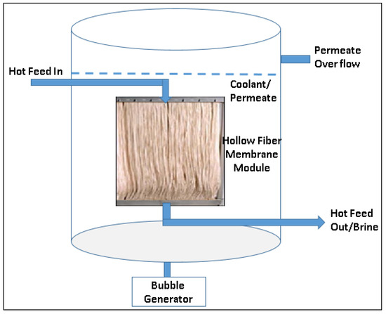 SMD is a recently introduced MD process configuration. In the SMD process membrane module is submerged either in a feed solution tank or in a coolant stream. Module design and construction are very simple in an SMD configuration compared to other MD configurations. Apart from module simplicity, a major advantage of SMD is that it can be easily employed in other conventional MD configuration modes such as DCMD, VMD, and SGMD. Francis and co-workers [74] have carried out lab-scale tests on SMD process using hollow fiber membranes and reported that the permeate flux is comparable with the other conventional MD configurations. Figure 6 shows a schematic of SMD process configuration using a hollow fiber membrane module. A flat sheet membrane with a plate-and-frame closed module can also be employed in the SMD process. Figure 6 shows the SMD process in DCMD mode in which an open membrane module is submerged in the cold stream and a hot feed stream flows through the lumen side of the membrane. It is also possible to design in the other way such as the membrane module can be submerged in the hot feed stream and coolant stream can be passed through the lumen side of the membrane. One or more bubble generators are be used to reduce the temperature polarization phenomenon during the operation. Researchers have also been reported the use of microbubbles in the feed solution to enhance the permeate flux [93]. In a submerged VMD process, a hot feed stream can be passed through the lumen side of the hollow fiber membrane bundle and a vacuum could be applied at the shell side of the membrane bundle fixed in a membrane module or vice versa. This work has been published as a US patent application in 2016 [75].