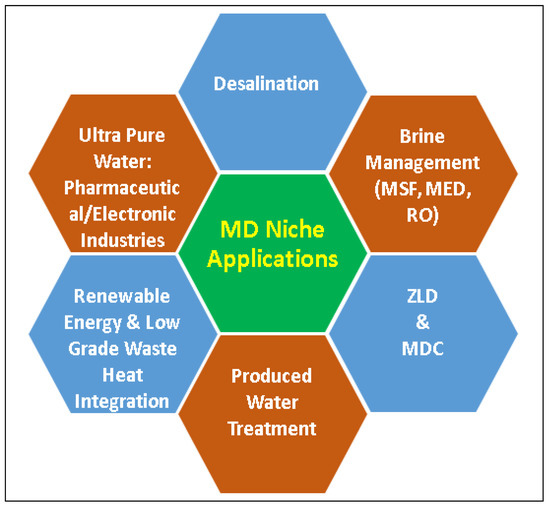 Apart from seawater desalination, there are several applications where MD process can be used in the reclamation of freshwater. Brine management or brine treatment is one among them in which the MD process can be integrated with conventional desalination plants such as MSF, MED, and RO, and use brine from these plants to extract freshwater. Since MD can operate at very high salinity, the industry could avail the benefit of the MD process to reduce the brine volume and reduce the difficulties in brine disposal. MD can even be applied for zero liquid discharge (ZLD) or minimum liquid discharge (MLD) process and recover the valuable minerals in the brine using a process known as membrane distillation crystallization (MDC). A huge volume of wastewater is generated every day in the oil and gas industry. Treating this produced water is a possible niche application of the MD process. MD process could reject almost 100% salts and nonvolatile contaminants and produce ultrapure water for pharmaceutical and electronic industries. Niche applications of the MD process can be demonstrated as shown in Figure 10 [122,123].
