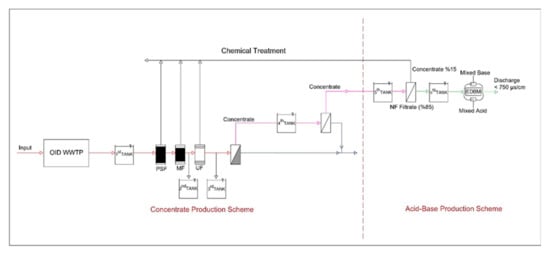 Field studies were carried out at the APWWTP, with a capacity of 5 m3/h. APWWTP used in the study encompasses pressure sand filter (PSF), TF-716 microfiltration (MF), mini UF-4 ultrafiltration (UF), and TFZ 29000 reverse-osmosis (RO) systems. The concentrate resulting from the reverse-osmosis process is fed to the EDBM system for acid-base production. The flow chart of the pilot plant is illustrated in Figure 1.