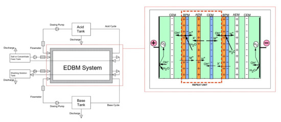 Expansions of population and economic development have led to an increasing freshwater deficit [1]. Water and wastewater treatment efficiency, including recovery of resources, has become a top factor in the emergence of sustainable procedures for effective brine recovery and valorization [2]. This should result in the creation of new or better innovative water-treatment methods in real-world settings. Desalination technologies have received significant attention in recent years as a vital option to address water scarcity challenges all over the world [3]. For the time being, the widely known and used desalination technologies are reverse osmosis (RO), nanofiltration (NF), electrodialysis (ED), multistage flash distillation, and multiple-effect distillation. RO contributes about 65% of total installed desalination capacity worldwide [4]. The handling/treatment of the concentrated brine byproduct, on the other hand, is a key challenge in the use of RO desalination. The recovery rate of industrial RO desalination systems is normally about 50%. Therefore, over half of the feed water is released as saline into the sea or adjacent regions, with serious environmental consequences [5]. Membrane clogging is another issue with RO desalination. This problem occurs as a result of all strong acids (e.g., HCl or H2SO4) and bases (e.g., NaOH) utilized to adjust pH values or reagents used for cleaning [6]. Electrodialysis bipolar membrane (EDBM) is a technology that integrates bipolar membranes with traditional electrodialysis [7]. EDBM is a promising method for treating and valorizing desalination brines by producing acids and bases, which are valuable compounds in almost any desalination plant. EDBM has also been effectively utilized to produce or purify acids, as well as to adjust pH during fermentation or chemical synthesis in biochemical and food processing [8,9,10]. Furthermore, there are some applications in the removal of heavy metals and exhaust emissions [11,12,13].