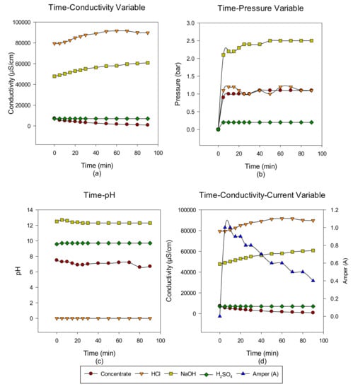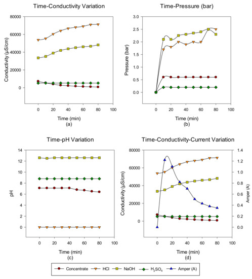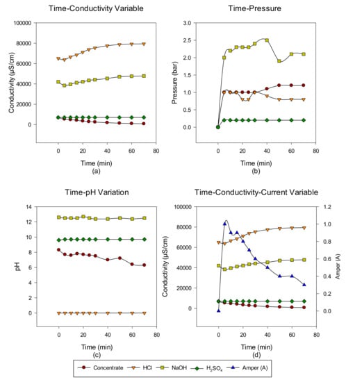 NaCl–NaOH–HCl–Na2SO4 (a) conductivity, (b) pressure, (c) pH, and (d) conductivity and ampere change between 0 and 70 min.