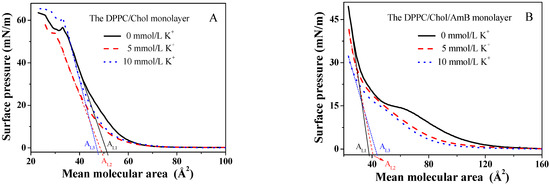 According to the π-A isotherms, the limiting molecular area can be calculated just by extrapolating the linear part of the curve according to the lowest compressibility, which is taken as the region of the surface pressure corresponding to the linear part [55]. The limiting molecular area of the mixed monolayer in the absence of the K+ ions and in the presence of 5 mmol/L and 10 mmol/L K+ ions is marked as , and in Figure 1. The K+ ions decreased the limiting molecular area of the DPPC/Chol mixed monolayer, and the limiting molecular area was smallest in the presence of 10 mmol/L K+ ions. However, the K+ ions increased the limiting molecular area of the DPPC/Chol/AmB mixed monolayer, and the limiting molecular area was the largest in the presence of 10 mmol/L K+ ions. This indicated that the potassium ions may affect the interaction between AmB and the lipid molecules, and that the AmB molecules were sensitive to potassium ions.