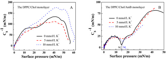 From Figure 2, the maximum value of for the DPPC/Chol mixed monolayer was greater than that for the DPPC/Chol/AmB mixed monolayer, and it did not matter if potassium ions were present or not. It was suggested that AmB caused the DPPC/Chol mixed monolayer to be less condensed. In Figure 2A, the maximum value of for the DPPC/Chol mixed monolayer decreased due to the presence of 5 mmol/L K+ ions, but increased because of the presence of 10 mmol/L K+ ions. The potassium ions can affect the molecular arrangement on the DPPC/Chol mixed monolayer, which was different depending on its concentration. The potassium caused the DPPC/Chol mixed monolayer to become more condensed in the concentration of 10 mmol/L, but induced the mixed monolayer to become less condensed in the concentration of 5 mmol/L. However, for the DPPC/Chol/AmB mixed monolayer, the potassium ions caused the monolayer to become more condensed in the concentration of 5 mmol/L, but induced the mixed monolayer to become less condensed in the concentration of 10 mmol/L.