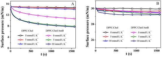 The surface pressure–time (π-t) curves of the DPPC/Chol mixed monolayer and the DPPC/Chol/AmB mixed monolayer at the air–water interface in the absence and presence of potassium ions (5 mmol/L and 10 mmol/L) at 15 mN/m (A) and 30 mN/m (B).