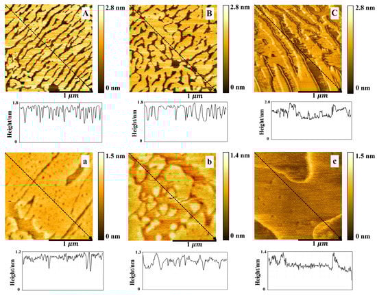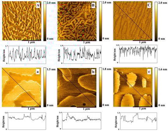 The DPPC/Chol mixed monolayers were transferred onto the surface of mica sheets at the surface pressure of 15 mN/m. The bright (higher) areas and the dark (lower) areas were observed on the DPPC/Chol film (Figure 5A–C), which was highly similar to the results of A. Botet-Carreras et al. [57]. The bright areas may be attributed to the segregation of enriched Chol domains [57]. In the absence of K+ ions, the enriched Chol domains in the DPPC/Chol mixed monolayer film formed a closely arranged “curved dendritic” shape, the height of which was about 1.3~1.7 nm (Figure 5A). In the presence of 5 mmol/L K+ ions, the morphology did not change, but the enriched Chol regions were more compact than that in the absence of the K+ ions, and the height was about 1.1~1.9 nm (Figure 5B). In the presence of 10 mmol/L K+ ions, the morphology of the DPPC/Chol mixed monolayer film in the Chol-rich regions changed to an “uncurved dendritic” shape with the height of about 1.1~1.8 nm (Figure 5C). The dark region was at the height of 0.3~0.6 nm in the absence of K+ ions. In the presence of AmB, the bright area of the lipid monolayer was shaped similarly to a large island with a height of about 1.0~1.4 nm (Figure 5a–c). The height of the dark region was 0.6~0.8 nm. As the potassium ions’ concentration increased, the area of the lower region seemed to increase slightly.