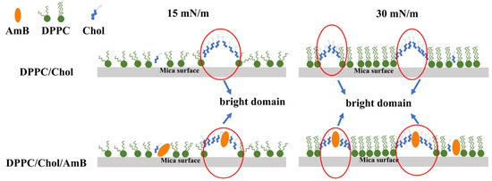 An illustration of the possible molecular arrangement of the DPPC/Chol mixed LB film and the DPPC/Chol/AmB mixed LB film is shown in Figure 7. At 15 mN/m, the bright domains of the DPPC/Chol mixed LB film may be attributed to the segregation of enriched cholesterol domains. At the dark domains, cholesterol did not accumulate. The surface pressure of 15 mN/m corresponded to the phase transition of the AmB component, so the orientation of the AmB molecules on the interface may change from horizontal to vertical, and the longitudinal axis of most AmB molecules may have a certain inclination angle with the interface. For the DPPC/Chol/AmB mixed LB film, AmB mainly expressed an affinity for cholesterol molecules. At the lower domain, the cholesterol molecules did not aggregate, and the longitudinal axis of the AmB molecules was obliquely inclined to the interface. At the higher domain, cholesterol aggregated, and the vertical axis of the AmB molecule was vertical. At 30 mN/m, the molecules were packed together, the cholesterol molecules were more concentrated, and the orientation of the AmB was vertical. Therefore, according to the height analysis of the AFM images, the potassium ions may interfere with the interaction between AmB and the cholesterol-rich region, which was stronger at 15 mN/m than that at 30 mN/m. Moreover, the slight disturbance caused by the potassium ions was almost not effected by the concentration of the potassium ions at 30 mN/m.