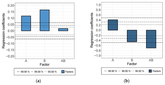 The effect of increasing the rotational speed for the rotor-stator dispersing step (parameter “A” in Figure 3) was positive for both the suspension and the applied layer, though the significance of the effect was higher in the case of the suspension (in consideration of confidence intervals). An increased treatment duration (“B”) increased the conductivity in the suspension, but in the applied layer, the opposite effect was detected. Moreover, a strong interaction was monitored.