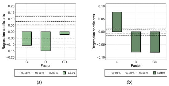 Effects of factors C, D, CD, on electrical conductivity of (a) the suspension and (b) the formed dry layer, for three-roll-mill dispersing step. C: increasing rotational speed of roller, D: increasing gap width, CD: interaction.