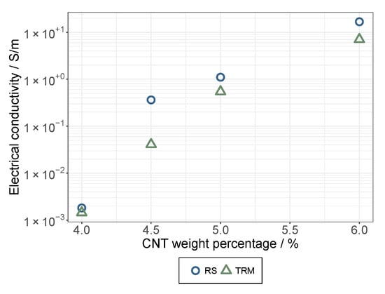 As depicted in Figure 5, the prepared dried CA composite films exhibited an appreciable electrical conductivity. This observation is in good agreement with recent findings reported by Earp et al. [] regarding the high conductivity of CNT composites below the theoretical percolation values (9–18%). Furthermore, a strong effect when increasing the CNT content in a very narrow window between 4.0 and 6.0 wt.% was observed. Regardless of the dispersion method, the electrical conductivity increased by several orders of magnitude.