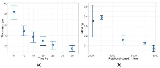 In the first experiments, the time dependence of the layer thickness was determined by interrupting the coating process after certain time increments. The carriers were weighed before and after coating and the grammage and layer thickness were calculated using the carrier’s area and the density of the dispersion. For example, an experiment at 4000 rpm coating speed with 1 mL dispersion on the PP carrier is illustrated in Figure 6a.