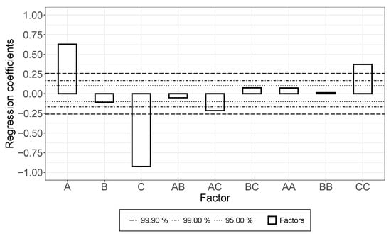 The results of this study are illustrated in Figure 7. As seen in the study regarding the coating of the CA dispersion, the coating speed had a strong negative effect with a nonlinear, but positive, fraction, which means a disproportionate rise. The coating time only had a weak, non-significant, negative effect. The concentration of the polymer solution had a strong positive effect, which was caused by the increase in viscosity (Section 3.3) that comes with higher concentrations. The results also showed an interdependence between polymer concentrations and the coating speed. This indicates a decrease in layer height if the concentration and the coating speed are increased at the same rate.