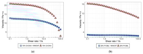 In the RS, the dispersion is agitated by a stirrer that is encased in a radial-mounted stator with a narrow gap between the two. The high-speed rotation of the rotor induces mixing energy and shear stress at a higher rate compared to conventional agitators []. In this study, a L5M-A (Silverson, GB) with a blade design [] rotor and a radial emulsion sieve style [] stator was applied. The outer diameter of the rotor was 31.2 mm and the inner diameter of the stator was 31.6 mm, resulting in a gap size of 0.2 mm. One hundred grams of the polymer solution and MWCNT predispersions were manually mixed in a beaker, which was then placed in a cooling bath set to 15 °C. The head was immersed in the mixture and placed in the center of the fluid body, with a distance of at least 1 cm from the bottom of the beaker and the surface of the mixture. After switching on the RS, the speed was slowly increased to 6000 rpm and automatically stopped after 30 min.