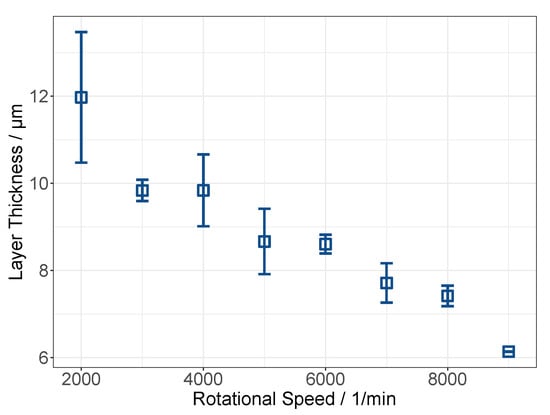 To further analyze the effect of coating speed on wet layer mass, experimental results are shown in Figure 6b. As predicted by the parameter study, the amount of dispersion that remained on the carriers decreased with an increasing coating speed. In spin coating, the amount of material that was discharged from the carrier and, thereby, the layer thickness, was determined by the equilibrium between centrifugal force and resistance caused by the viscosity of the fluid []. At higher coating speeds, the equilibrium was shifted to thinner layers due to the higher centrifugal force.