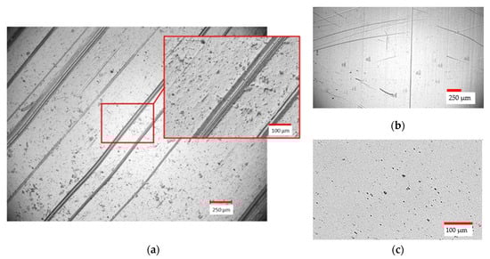 Irregularities found on the CA membrane surfaces after coating and drying. A pattern of defects with a close-up (a). In hindsight, the defects were also found on the non-coated PES carrier (b), but, as a consequence, the CA membrane, without visible defects, could be produced (c).