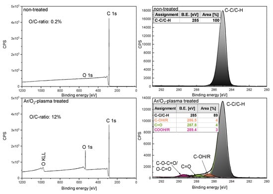 In Figure 12, the results of the XPS analysis of the non-treated polymer before and after Ar/O2-plasma treatments are shown. The non-treated PP surface contained mainly carbon (approximately 99.8%) and only traces of oxygen (0.2%). After the treatment in Ar/O2-plasma in the survey scan, an increased amount of oxygen (approximately 11%) and a reduced amount of carbon (approximately 89%) with an O/C element ratio of 12% was observable.