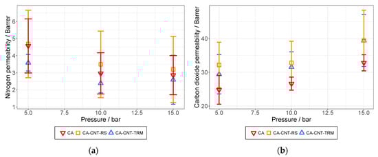 The first tests with the CA-based membranes showed that all membranes had a low permeability to N2. No effects of the layer thickness were found and even the membranes with visible surface defects showed no reduced gas tightness. Permeabilities measured at feed pressures of 5, 10, and 15 bar are illustrated in Figure 14a. It can be seen that the permeability declines with increasing pressures. For comparison, the measured values of CO2 permeation are shown in Figure 14b. Unlike the N2 permeability, the CO2 permeability rose with increasing pressure. This was also observed by Moghadassi et al. [] analyzing similar types of membranes. It can be explained by the pressure dependency of CO2 solubility in CA [].