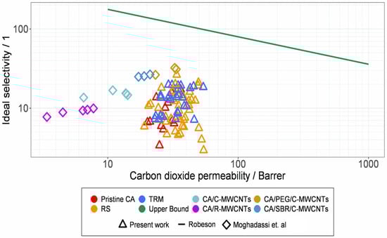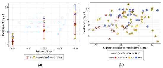 From the permeability curves in Figure 14, it can already be interpreted that the selectivity rises with increasing pressure due to the opposite curve of both permeabilities. What also stands out is that the membranes prepared from the TRM dispersions exhibited the highest selectivities while they were astride the membranes from the RS dispersions regarding the CO2 permeability. The main cause for the overall good performance of these membranes seems to be the high retention of N2 that is indicated in Figure 14a. From Figure 14b, it also became apparent that the CO2 permeability could overall be improved by the addition of MWCNTs into the CA membrane.