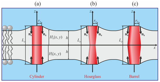 In the present work, we considered the interactions between transmembrane proteins mediated by elastic deformations of the membrane. Effective TMD shapes were assumed to be cylindrical, hourglass-like, and barrel-like (Figure 1).