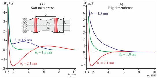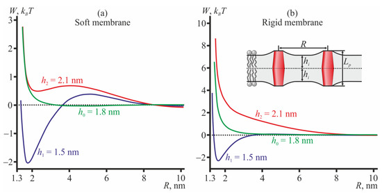 For TMDs with a barrel-like shape, the dependence of the interaction potentials on the monolayer thickness is the opposite (Figure 4): barrel-like TMDs attract each other in the thin bilayer (h1 = 1.5 nm) and repel each other in the thick bilayer (h2 = 2.1 nm) and in the medium thickness bilayer (h0 = 1.8 nm) in both soft (Figure 4a) and rigid (Figure 4b) membranes.
