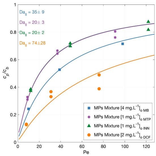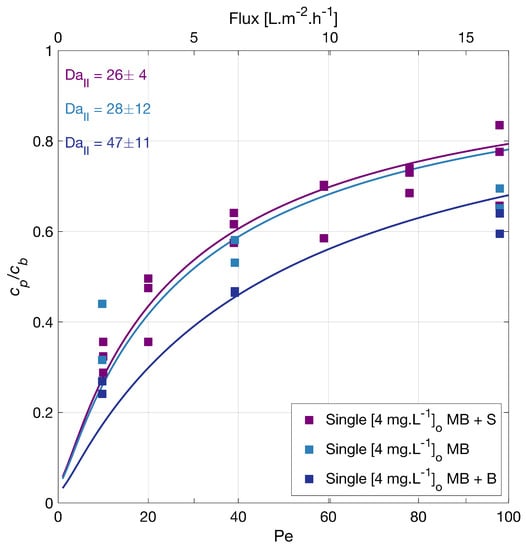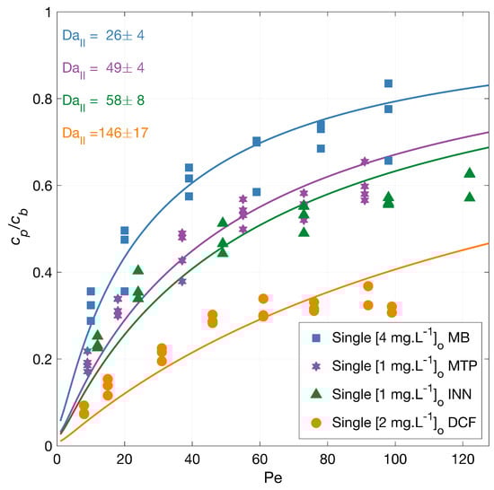 The intrinsic membrane retention is represented by 1- (Equation (1)) in the 1D transport and surface reaction model. To calculate the value of , cross-flow experiments with iopamidol (the biggest molecule among the MPs used in these experiments) and methylene blue were carried out with fluxes of 16.2, 32.5, 48.7, and 65.0 L·m·h. No significant differences were detected in the retentate and permeate concentrations for the tested flows; therefore, we justify using = 1 in the 1D model, referring to no retention by the membrane (). The equation to fit the permeate concentration versus Pe then only contains one fitting parameter, Da: