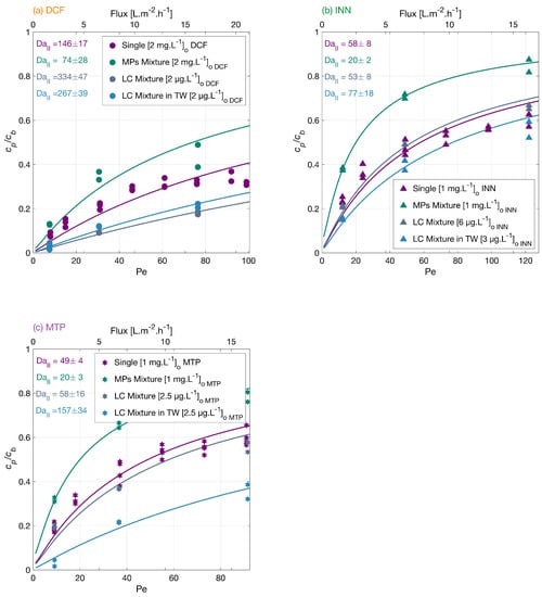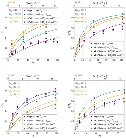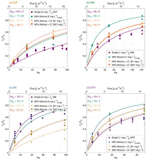 Degradation experiments with diclofenac (DCF), iopamidol (INN), methylene blue (MB), and metoprolol (MTP) independently (singles) were conducted in a single-pass dead-end PMR under an average irradiation intensity of 210 W·m. The normalized permeate concentration (/) as a function of the Péclet number (Pe = ) is plotted together with model fits and shown in Figure 1.