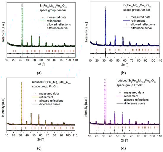 Sr2Fe1.2Mg0.2Mo0.6O6−δ and Sr2Fe0.9Mg0.4Mo0.7O6−δ materials were synthesized by the high-temperature solid state reaction method, with calculated stoichiometric amounts of SrCO3, Fe2O3, MgO, and MoO3 (all with ≥99.9% purity) compounds as initial chemicals. All needed chemicals were milled in a high-efficiency Spex Sample-Prep 8000 M planetary ball mill, and afterwards, the well-milled powders were pressed into pellets and sintered at 1200 °C for 10 h in air. The crystal structure of the obtained samples was characterized by XRD measurements using a Panalytical Empyrean diffractometer in the 10–110 deg range with CuKα radiation. The redox stability of the studied materials was investigated by the reduction in compounds in 5 vol.% H2/Argon at 1000 °C for 10 h. The in situ oxidation of the reduced Sr2Fe1.2Mg0.2Mo0.6O6−δ and Sr2Fe0.9Mg0.4Mo0.7O6−δ compounds in air was studied by the high-temperature XRD (HT-XRD) measurements performed on a Panalytical Empyrean apparatus equipped with an Anton Paar HTK 1200N oven-chamber. The collected XRD data were refined with the Rietveld method applying the GSAS/EXPGUI software [,].