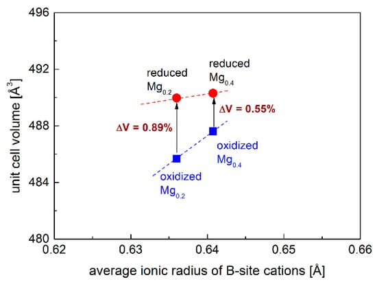 Normalized unit cell volume of reduced and oxidized Sr2Fe1.2Mg0.2Mo0.6O6−δ (Mg0.2), Sr2Fe0.9Mg0.4Mo0.7O6−δ (Mg0.4) as a function of B-site cations’ ionic radius. Error values are smaller than the visible points. The average ionic radius of B-site cations was calculated only using the ionic radius of Fe3+ and Mo6+ cations for a direct comparison of the relative volume change of reduced and oxidized oxides.