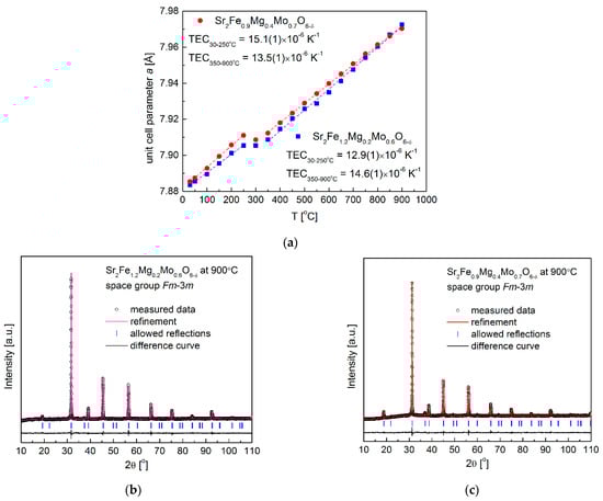 For further studies of the redox stability of electrode materials, the reduced Sr2Fe1.2Mg0.2Mo0.6O6−δ and Sr2Fe0.9Mg0.4Mo0.7O6−δ samples were in situ oxidized in air utilizing HT-XRD measurements (Figure 3a–c). The lattice parameters of samples at different temperatures can be calculated by the Rietveld refinement of collected HT-XRD data, and the obtained unit cell parameter variations of the investigated compounds are depicted in Figure 3a. Firstly, the unit cell parameter a of both the two samples linearly increases with the temperature to 250 °C, showing the thermal expansion of reduced materials in this low temperature range. The significant (non-linear) change in the lattice parameter occurs at around 300 °C, indicating the oxidation of the reduced samples. The oxidation of the reduced samples causes the decrease in the unit cell parameter a, which is due to the oxidation of Fe2+/Fe3+ and Mo4+/Mo5+ to high oxidation states (Fe3+/Fe4+ and Mo6+). The already oxidized materials show linear thermal expansion above 350 °C. The thermal expansion coefficients (TEC) of samples shown in the inset can be derived with the fitted linear slope. In general, the TECs obtained from the HT-XRD measurements for both the two materials are relatively low and in the range of 12.9–15.1 × 10−6 K−1. Those values are comparable with the TEC values of typical electrolytes [], which indicates the possible good mechanical cohesion of electrode materials with electrolytes. For both the two materials, no phase transition has been observed, and the crystal structure with the Fm-3m space group is stabilized up to 900 °C (Figure 3b,c).
