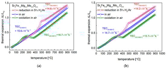 Thermal expansion behavior of (a) Sr2Fe1.2Mg0.2Mo0.6O6−δ and (b) Sr2Fe0.9Mg0.4Mo0.7O6−δ materials in air, reduction in 5 vol.% H2/argon, and oxidization in air of the reduced oxides.