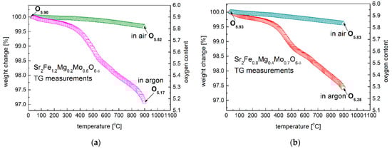 The oxygen content of Sr2Fe1.2Mg0.2Mo0.6O6−δ and Sr2Fe0.9Mg0.4Mo0.7O6−δ at room temperature was determined by iodometric titration. Sr2Fe1.2Mg0.2Mo0.6O5.90 and Sr2Fe0.9Mg0.4Mo0.7O5.93 are obtained at room temperature, which shows the presence of the same average iron oxidation state, with +3.17 in both materials. This indicates the considerable dominant existence of Fe3+ (83.3%) and a small amount of Fe4+ (16.7%) present in both Sr2Fe1.2Mg0.2Mo0.6O5.90 and Sr2Fe0.9Mg0.4Mo0.7O5.93 perovskites. The oxygen content change of Sr2Fe1.2Mg0.2Mo0.6O6−δ and Sr2Fe0.9Mg0.4Mo0.7O6−δ oxides was measured as a function of temperature up to 900 °C by TG studies in air and in argon, respectively (Figure 5a,b). The measured oxygen content of materials is presented in Table 3. Both the two samples show a similar content of oxygen nonstoichiometry at 900 °C in air, with δ = 0.18 for Sr2Fe1.2Mg0.2Mo0.6O6−δ and δ = 0.17 for Sr2Fe0.9Mg0.4Mo0.7O6−δ. The additional oxygen vacancies in the high-temperature range are created in the materials, according to the reaction: . In the argon atmosphere, a substantial oxygen content change has been recorded for both the two materials. The initial start of a considerable oxygen content drop is at around 350 °C. Since the reduction energies of Fe3+/Fe2+ are much lower than that of Mo6+/Mo5+ [,], the first reduction in the samples can be ascribed to the reduction in iron cations to Fe2+. The second step change (above 550 °C) can be related with the reduction in Mo6+ to Mo5+/Mo4+ and the further increase in the oxygen vacancies concentration []. The oxygen contents of Sr2Fe1.2Mg0.2Mo0.6O6−δ and Sr2Fe0.9Mg0.4Mo0.7O6−δ samples in argon are 5.17 and 5.28, respectively. Therefore, the relative oxygen nonstoichiometry changes ∆δ of Sr2Fe1.2Mg0.2Mo0.6O6−δ and Sr2Fe0.9Mg0.4Mo0.7O6−δ samples in argon up to 900 °C are 0.73 and 0.65, respectively. The higher content of redox couples of Fe3+/Fe2+ and Mo6+/Mo5+ in less Mg-doped Sr2Fe1.2Mg0.2Mo0.6O6−δ allows ro4 a generation of more oxygen vacancies than in Sr2Fe0.9Mg0.4Mo0.7O6−δ, which indicates that the increased content of magnesium in materials does not favor the creation of oxygen vacancies.