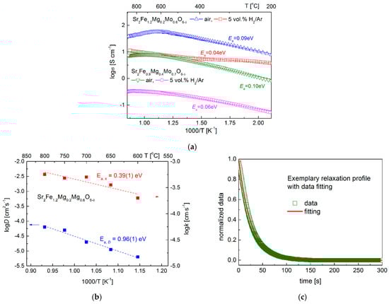 (a) Electrical conductivity of Sr2Fe1.2Mg0.2Mo0.6O6−δ and Sr2Fe0.9Mg0.4Mo0.7O6−δ materials in air and 5 vol.% H2/Ar, (b) diffusion coefficients D and k measured as a function of temperature for Sr2Fe1.2Mg0.2Mo0.6O6−δ sample, and (c) an exemplary normalized relaxation profile with fitting.