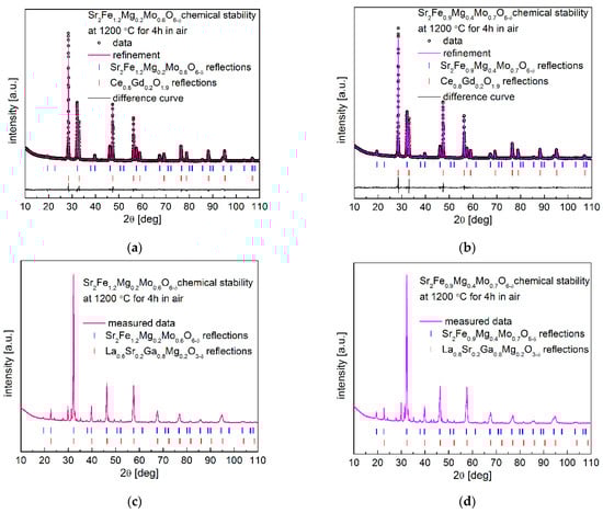 The chemical stability of electrode materials and their compatibility with the used electrolytes in an operating temperature range are critical for the long and stable performance of SOFCs. Therefore, the chemical stability and compatibility of Sr2Fe1.2Mg0.2Mo0.6O6−δ and Sr2Fe0.9Mg0.4Mo0.7O6−δ with typical electrolytes Ce0.8Gd0.2O1.9 (CGO20) and La0.8Sr0.2Ga0.8Mg0.2O3−d (LSGM) have been investigated at 1200 °C for 4 h in air. The Rietveld-refined XRD patterns of Sr2Fe1.2Mg0.2Mo0.6O6−δ and Sr2Fe0.9Mg0.4Mo0.7O6−δ with electrolyte (50:50 wt.%) powder mixtures are presented in Figure 7a–d. In Figure 7a,b, the XRD data after the studies of electrode materials with CGO20 show no additional phase, confirming the good chemical stability and compatibility of the electrode materials with the Ce0.8Gd0.2O1.9 electrolyte. Moreover, as can be observed from Table 5, the refined unit cell parameters of Sr2Fe1.2Mg0.2Mo0.6O6−δ and Sr2Fe0.9Mg0.4Mo0.7O6−δ after the chemical stability and compatibility studies are slightly smaller but very close to the results of as-synthesized materials presented in Table 1. The smaller unit cell parameters recorded after the annealing at 1200 °C for 4 h in air indicates the increased content of present Fe4+ (high oxygen state) in the materials. The studies show the possible long stable operation of SOFCs with Sr2Fe1.2Mg0.2Mo0.6O6−δ and Sr2Fe0.9Mg0.4Mo0.7O6−δ electrode materials towards the typical electrolyte Ce0.8Gd0.2O1.9. However, the studies on Sr2Fe1.2Mg0.2Mo0.6O6−δ and Sr2Fe0.9Mg0.4Mo0.7O6−δ with La0.8Sr0.2Ga0.8Mg0.2O3−d show the incompatibility of electrode materials with LSGM electrolyte, with the appearance of additional impurities observed in Figure 7c,d.