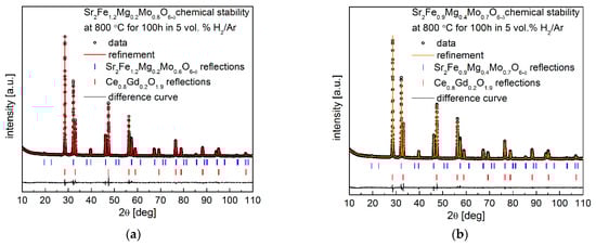In addition, the long-term chemical compatibility of the Sr2Fe1.2Mg0.2Mo0.6O6−δ and Sr2Fe0.9Mg0.4Mo0.7O6−δ electrode materials with Ce0.8Gd0.2O1.9 was investigated in 5 vol.% H2 in argon at 800 °C for 100 h. The collected XRD data after such studies shown in Figure 8a,b also confirm the excellent chemical stability and compatibility of the proposed electrode materials with the Ce0.8Gd0.2O1.9 electrolyte. Interestingly, as expected, the unit cell parameters of Sr2Fe1.2Mg0.2Mo0.6O6−δ and Sr2Fe0.9Mg0.4Mo0.7O6−δ after the long-term reduction at 800 °C (Table 6) are smaller than the values of materials reduced at 1000 °C (See Table 1). This is related to the lower content of reduced iron and molybdenum cations (contributing to smaller unit cell parameters) in materials annealed at 800 °C in 5 vol.% H2/Ar. The unit cell parameters of Ce0.8Gd0.2O1.9 presented in Table 6 are very close but a little bit bigger than the values of Ce0.8Gd0.2O1.9 recorded in Table 5, indicating the stability of Ce0.8Gd0.2O1.9 in the presence of studied electrode materials and a slight reduction in Ce0.8Gd0.2O1.9 in the atmosphere of 5 vol.% H2/Ar.
