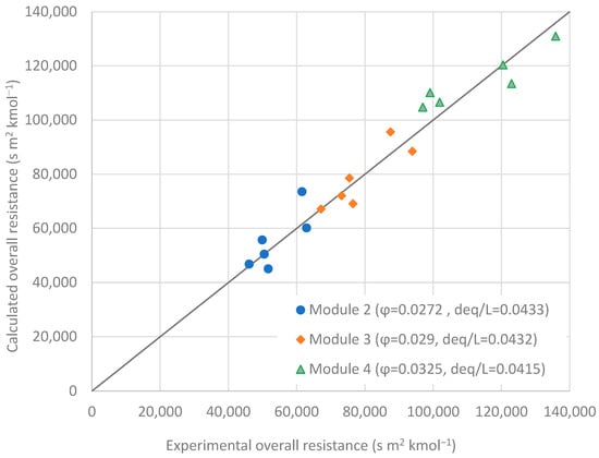 Parity graph of simulated overall resistances vs. experimental overall resistances for butanol permeation. Values were obtained and calculated for three modules at different flow rates.