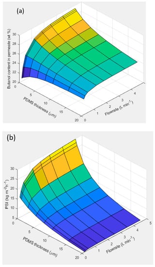Simulation showing the influence of the feed flow rate and thickness of the PDMS dense layer on (a) butanol content in permeate (wt%) and (b) PSI, for a membrane module 1 m in length (operating conditions: 40 °C; downstream pressure: 10 mbar; feed mixture: (1:2:1 wt%) ABE solutions).