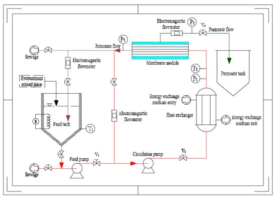 The experimental setup for the system is illustrated in Figure 1. The pretreated mixed juice was continuously added to the feed tank kept at a constant volume of 40 L throughout the experiment. The temperature of sugarcane juice in the feed tank was maintained at the required temperature by electrical heating. Then, the juice was circulated through the heat exchanger and into the membrane module by the action of the feed and circulation pumps. The membrane tubes were welded to stainless steel constructions like the shell and tube-type heat exchangers. No seals or potting compounds presented chemical or temperature compatibility issues. The function of the heat exchanger is to remedy the temperature of the electric heating and compensate for the heat loss of the pipeline. The permeate was collected in the permeate tank and the retentate was recycled into the feed tank. The values V1 and V2 were adjusted to enable the membrane module to satisfy the experimental requirements, such as TMP and crossflow velocity (CFV). The pressure on the permeate side was adjusted to V3. Drain valves were provided at the highest and lowest points of the system. The three electromagnetic flowmeters monitored the direct circulation, total circulation, and permeate flows, respectively. The pressure, temperature, and flow data were displayed and adjusted using the computer of the system.