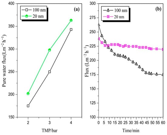 Figure 2a illustrates the pure water flux comparison between the 100 and 20 nm membranes under different operating conditions. The flux increased with an increase in TMP. The flux of the 20 nm stainless steel membrane was higher than that of the 100 nm membrane under different test pressures (temperature of 20 °C). This result may be explained by the effect of the different porosity values of the two membranes given the different casting processes.
