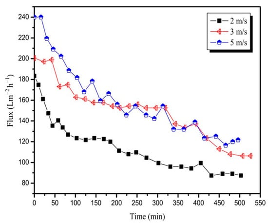 This study aimed to investigate the influence of CFV on flux in pretreated mixed juice. As shown in Figure 4, the initial flux increased with an increase in CFV. An increase in CFV from 2 to 5 m/s resulted in an increase in the initial flux from 183.4 Lm−2 h−1 to 240.0 Lm−2 h−1. This is because there was still space to store a certain volume of permeate between the membrane modules. As the membrane contamination increased, the flux decayed to different degrees, and the amount of accumulated permeate varied simultaneously. From the trend of flux decline with time, all flux declines caused by the 20 nm membrane at CFVs of 2, 3, and 5 m/s were significant, and the average fluxes of the three runs were 111.9, 148.6, and 158.1 Lm−2 h−1; the initial flux was reduced by approximately 50% at the end of the test. In addition, the smaller the CFV, the more serious the flux decay. At the beginning of filtration, the flux at 5 m/s of CFV was approximately 10% higher than the flux at 3 m/s of CFV owing to the increase in shear stress with an increase in CFV [25,26]. However, after 150 min of operation, as impurities in the juice accumulated on the membrane surface, the shear force was not sufficient to relieve the membrane fouling, and the flux at 5 m/s of CFV was similar to or even lower than that at 3 m/s of CFV.