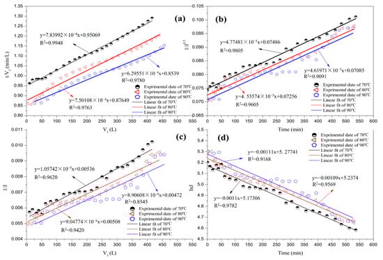 Linear fit with four fouling models at various temperatures: (a) cake filtration; (b) pore narrowing; (c) combination of external and progressive internal fouling; and (d) complete pore blocking.