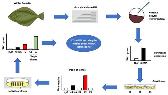 Expression cloning of the NaCl cotransporter, NCC. mRNA extracted from the winter flounder urinary bladder was injected into Xenopus oocytes and three days later the thiazide-sensitive and Cl−-dependent 22Na+-uptake was assessed. Once the expression was established, a cDNA from the urinary bladder was constructed and filters containing about 500 clones each were prepared. Pooled bacteria for each filter were used to extract their cDNA to in vitro transcribe cRNA that was used to inject oocytes and search for NCC activity. As expected, the level of expression from the pooled bacteria was higher than from the total mRNA. Then, cloned from the positive filter were studied by groups until the cRNA transcribed from a single individual clone (C7) induced the presence of the thiazide-sensitive and Cl−-dependent 22Na+-uptake, which as expected was higher than that observed from the pooled clones. C7 clone cDNA encoded for NCC [].