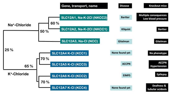The family is divided in two major branches. One composed by three members that use Na+ coupled to Cl−, with or without K+. Two of them are known as NKCC1 and NKCC2 (encoded by genes SLC12A2 and SLC12A1, respectively) and perform as Na-K-2Cl cotransporters. NKCC1 is present in basically all cells of the body and in epithelial cells its expression is polarized to the basolateral membrane. In this case the function of NKCC1 is to provide the cells with the K+ or Cl− ions to be secreted through the apical membrane, for example, the stria vascularis cells in the lateral wall of the cochlear duct of the inner ear that secrete K+ to the endolymph, or the airway epithelium in the respiratory tract that secretes Cl− into the lumen. NKCC2 is exclusively expressed in the apical membrane of the thick ascending limb of Henle’s loop of the nephron, which is the functional unit of the kidney. Its function is crucial for salt reabsorption, blood pressure regulation, and calcium, magnesium, potassium, and water homeostasis. The activity of NKCC2 is responsible for the increased osmolarity of the interstitium of the renal medulla that is required for water reabsorption by the collecting duct when water conservation is required. NKCC2 is the target of loop diuretics, such as furosemide or bumetanide, which are worldwide used to induce natriuresis for the treatment of edematous states such as that observed in patients with heart, liver or kidney failure, and nephrotic syndrome, amongst other syndromes [,,].