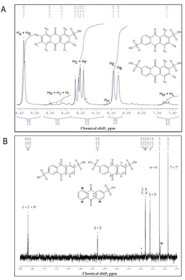 - Crossley, M.L. The separation of mono-β-, 2,6- and 2,7-sulfonic acids of anthraquinone. J. Am. Chem. Soc. 1915, 37, 2178–2181. [Google Scholar] [CrossRef]