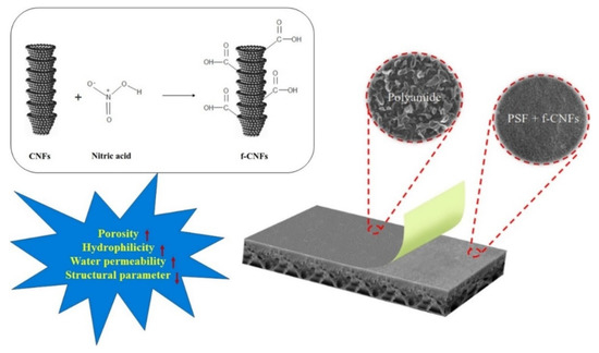 Usually, in order to improve the dispersion of CNFs in the polymer matrix, the initial materials are subjected to modification. In [62], Tavakol et al. developed CNFs-based thin film composite membranes for direct osmosis technology. Carboxylation of CNFs was carried out to increase surface hydrophilicity and improve dispersion in the polysulfone matrix. At the same time, the use of functionalized CNFs positively affects the structure, morphology and performance of direct osmosis membranes (Figure 4).
